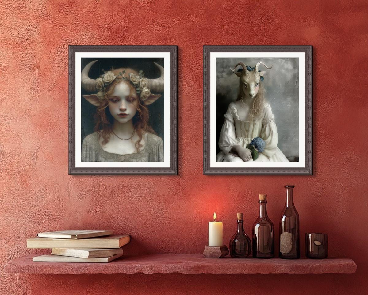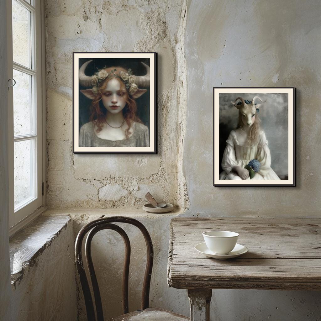 Welcome to my shop of unusual and eclectic wall art decor for the discerning lover of new art. All pieces are my own, limited editions of 40 prints, signed and numbered. My digital art prints begin with a 3D or AI image, heavily edited from that point with overlays, textures, overpainting, adjustments, and added elements. There is often a strong bent toward the surreal, but along the way my work leans heavily on pre-Raphaelite, Renaissance, Flemish, and Medieval schools of art, as well as pop surrealism and other newer schools. The finished product has a modern quality while staying true to the older schools.