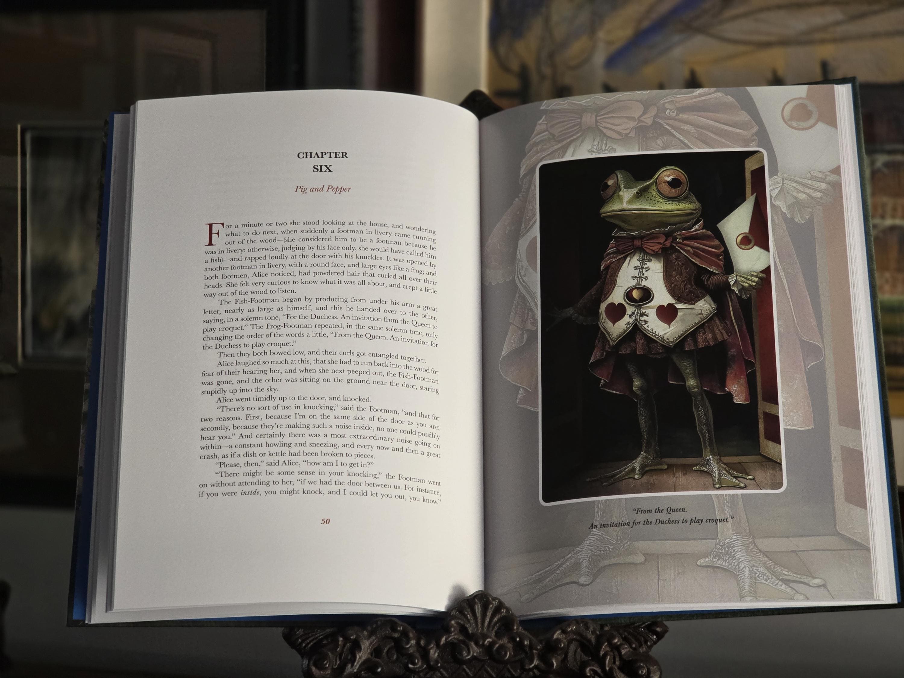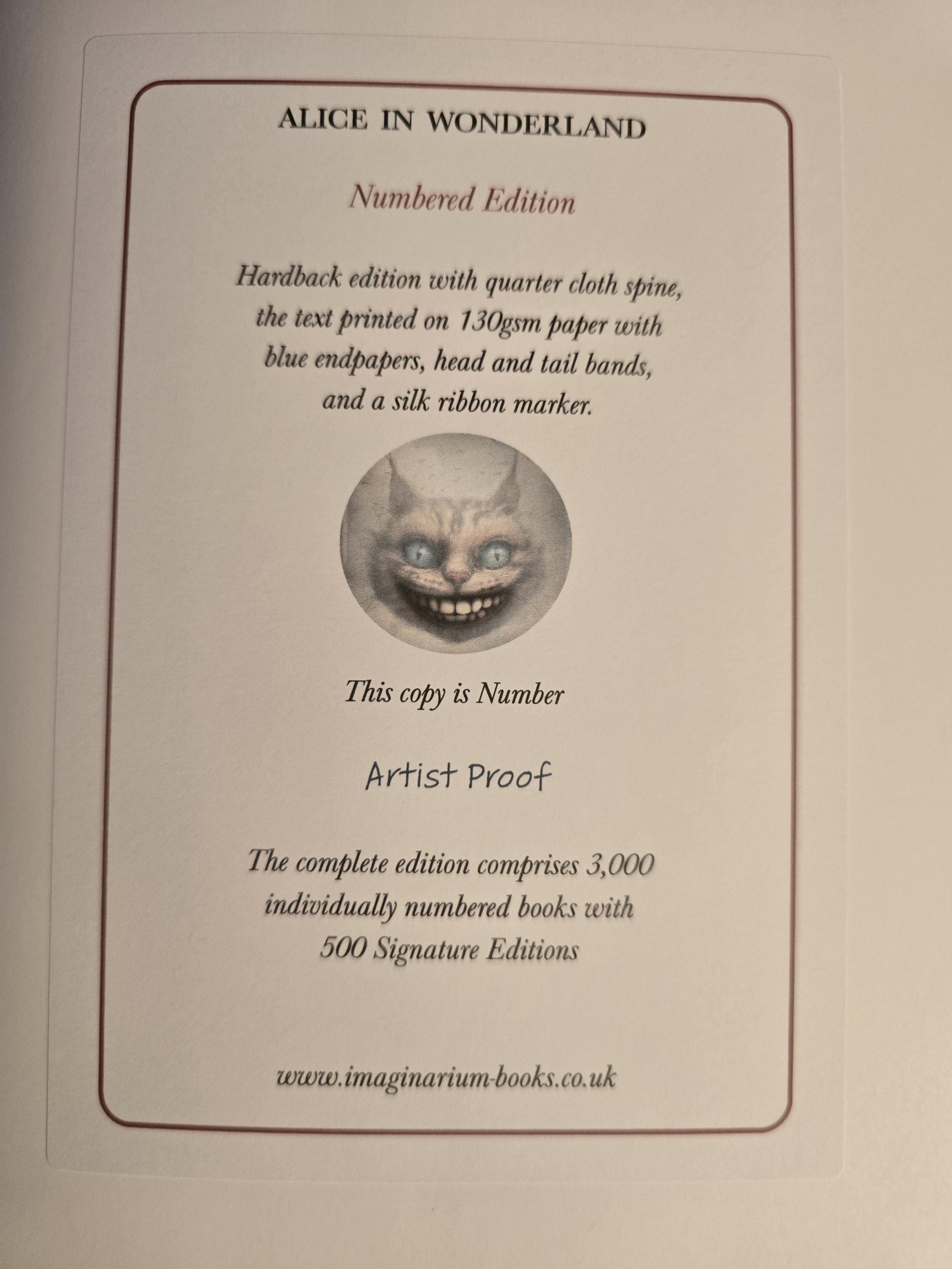Published in 2024 by Imaginarium Books, this 112-page edition of "Alice in Wonderland" comes in a large A4 format with silk bookmark ribbon. The cloth binding is gold embossed on the spine. The size would make this an ideal coffee table book – but it will also look handsome on a bookshelf. I am proud to say that critics have dubbed this edition among the most beautiful Alice collector's books in print.