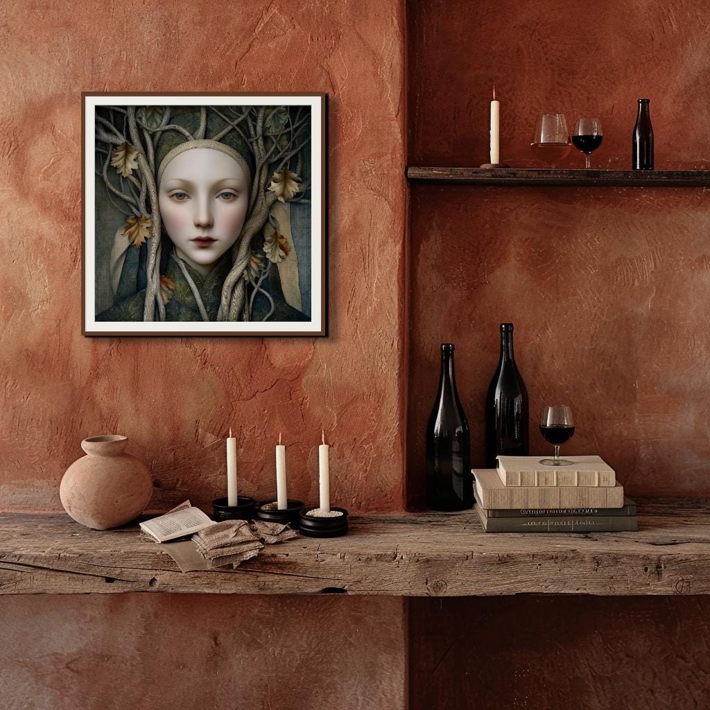 Welcome to my shop of unusual and eclectic wall art decor for the discerning lover of new art. All pieces are my own, limited editions of 40 prints, signed and numbered. My digital art prints begin with a 3D or AI image, heavily edited from that point with collaging, overlays, textures, overpainting, adjustments, added elements, and my own photographs. There is often a strong bent toward the surreal, but along the way my work leans heavily on pre-Raphaelite, Renaissance, Flemish, and Medieval schools of art, as well as pop surrealism and other newer schools. The finished product has a modern quality while staying true to the older schools.