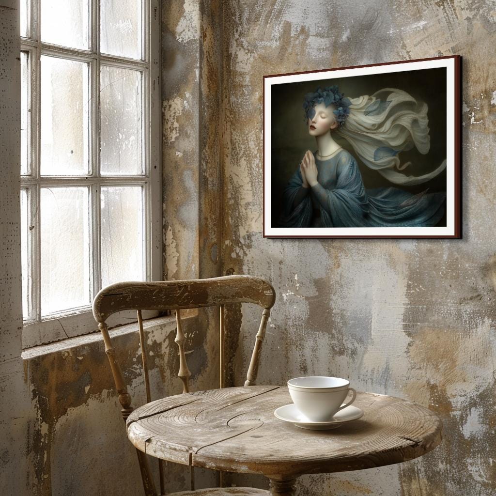 Welcome to my shop of unusual and eclectic wall art decor for the discerning lover of new art. As are all of my pieces, this artist proof is my own work. My digital art prints begin with a 3D or AI image, heavily edited from that point with collaged overlays, textures, overpainting, adjustments, and added elements. There is often a strong bent toward the surreal, but along the way my work leans heavily on pre-Raphaelite, Renaissance, Flemish, and Medieval schools of art, as well as pop surrealism and other newer schools. The finished product has a modern quality while staying true to the older schools.