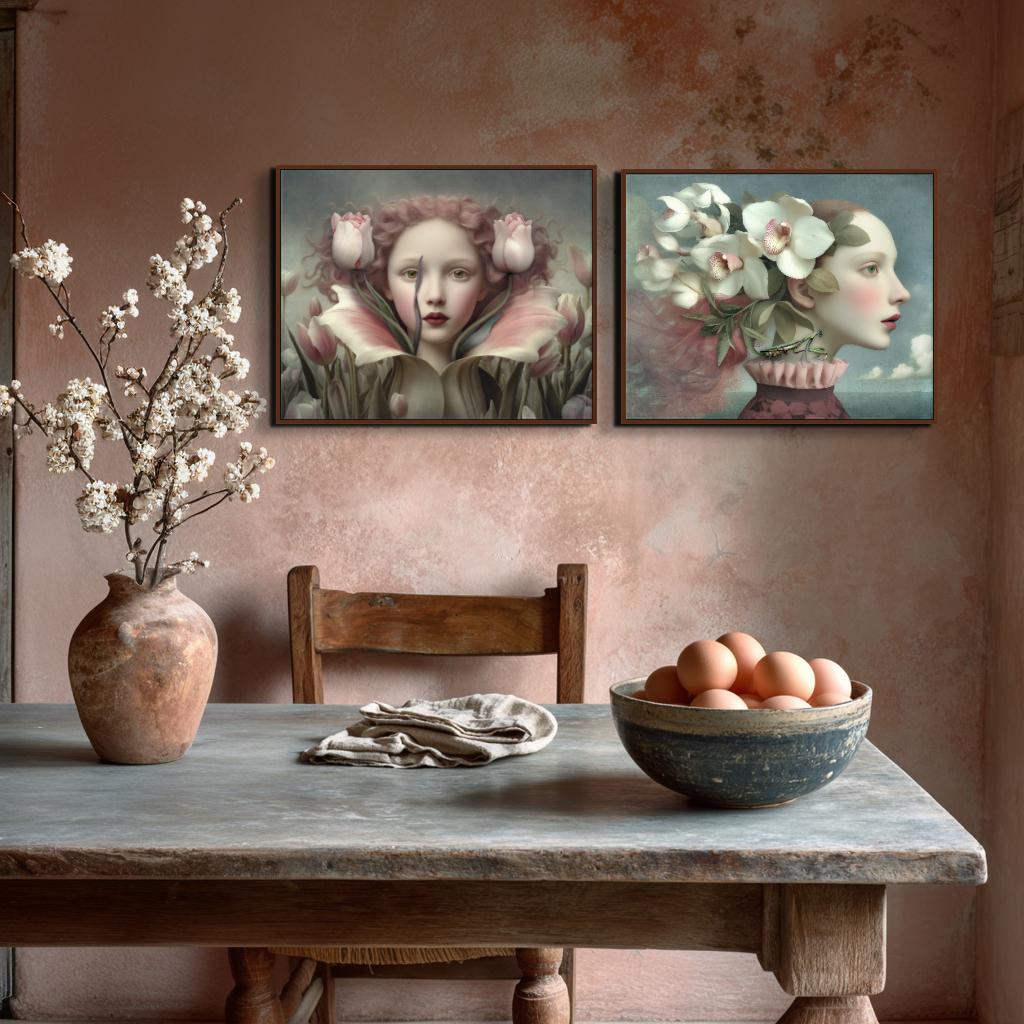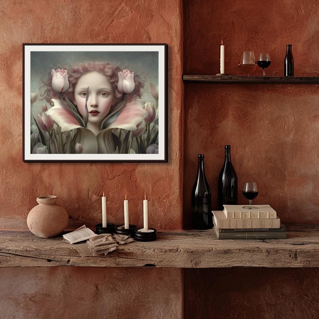 Welcome to my shop of unusual and eclectic wall art decor for the discerning lover of new art. All pieces are my own, limited editions of 40 prints, signed and numbered. My digital art prints begin with a 3D or AI image, heavily edited from that point with collaging, overlays, textures, overpainting, adjustments, added elements, and my own photographs. There is often a strong bent toward the surreal, but along the way my work leans heavily on pre-Raphaelite, Renaissance, Flemish, and Medieval schools of art, as well as pop surrealism and other newer schools. The finished product has a modern quality while staying true to the older schools.